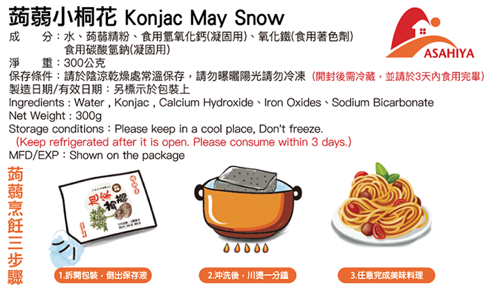 成份:水、蒟蒻精粉、食用氫氧化鈣(凝固用)、氧化鐵(食用著色劑)、食用碳酸氫鈉(膨脹劑)