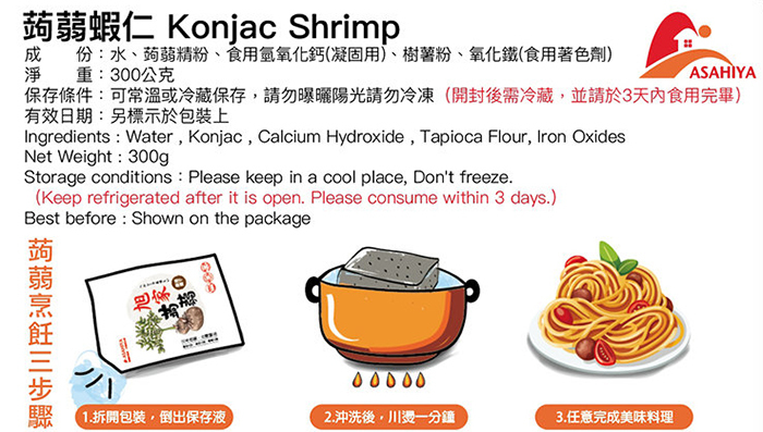 成份:水、蒟蒻精粉、食用氫氧化鈣(凝固用)、樹薯粉、氧化鐵(食用著色劑)