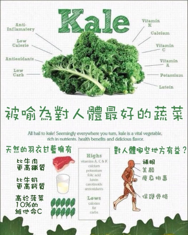 ❤ 羽衣甘藍Kale稱為營養密度最高的食物之一,卡路里極低,被譽為對人體最好的蔬菜